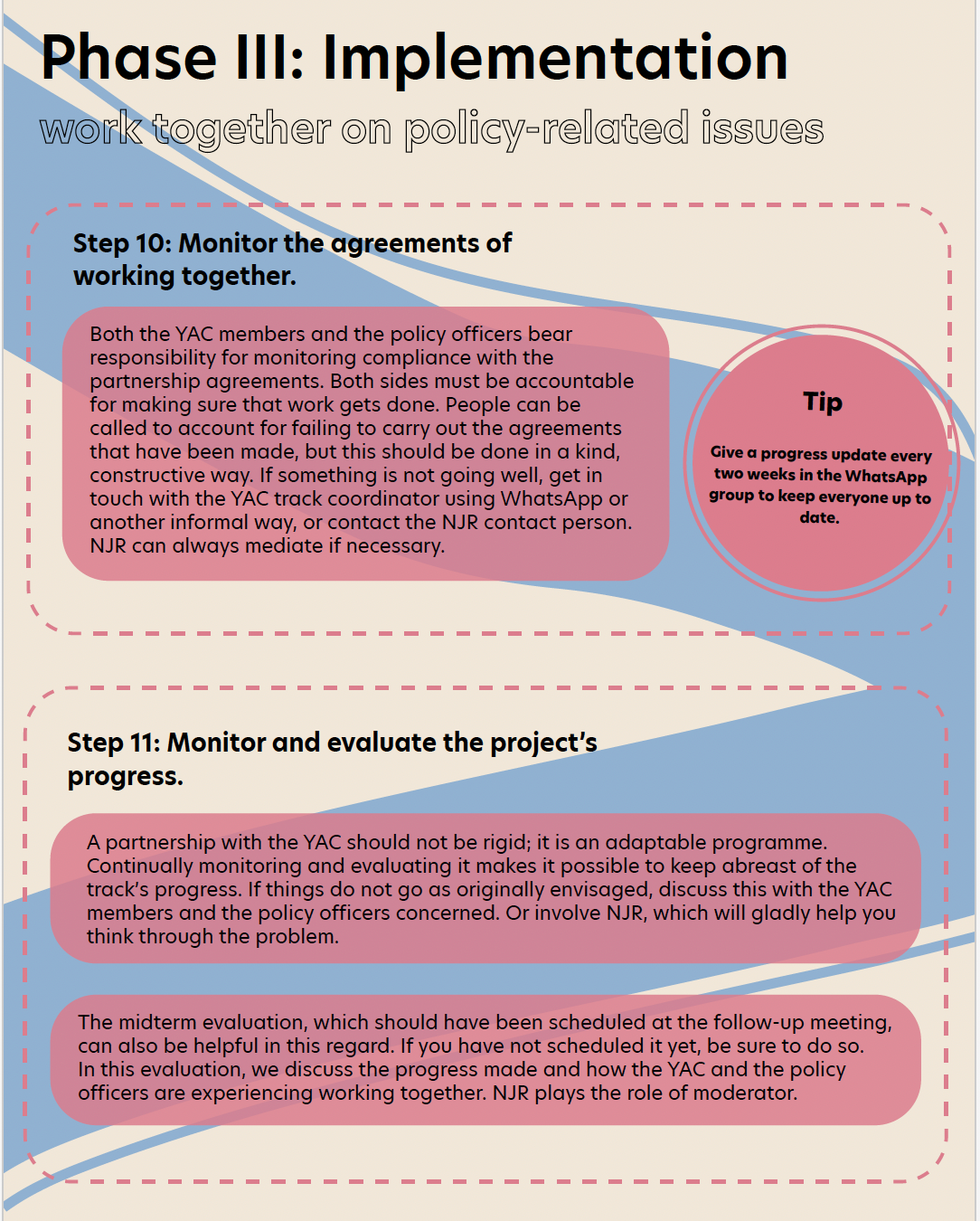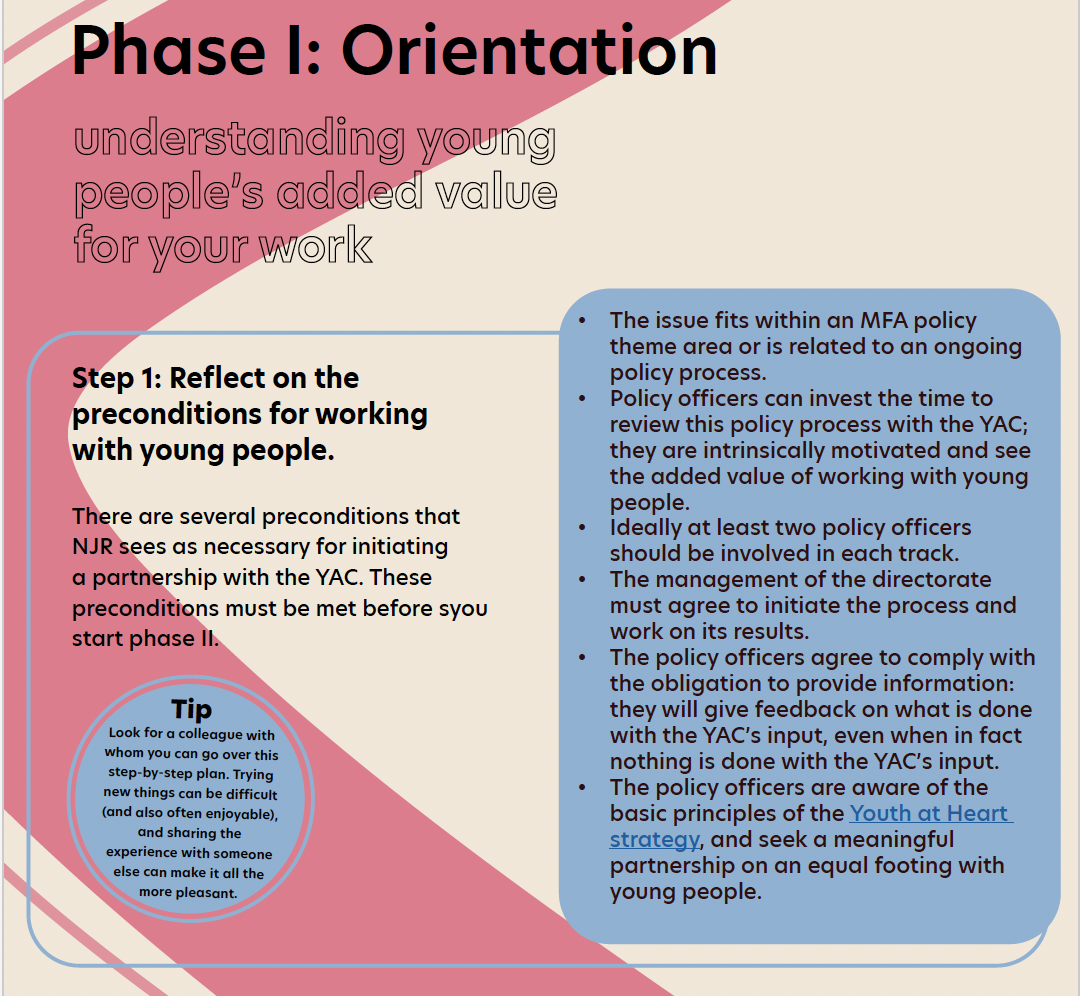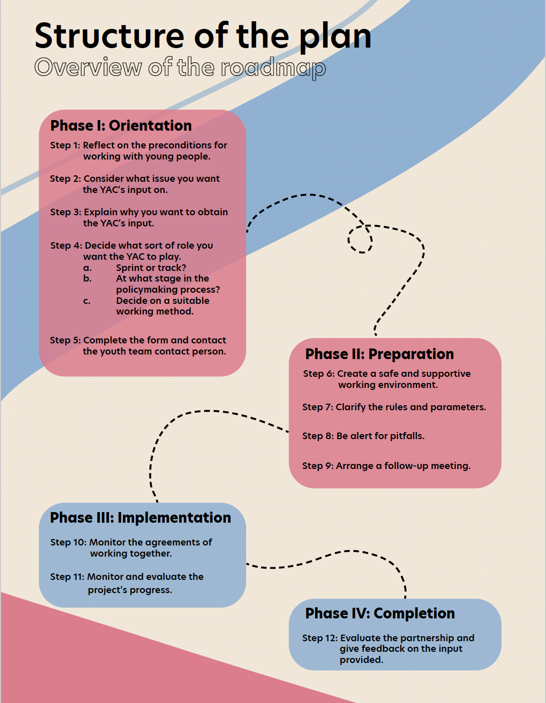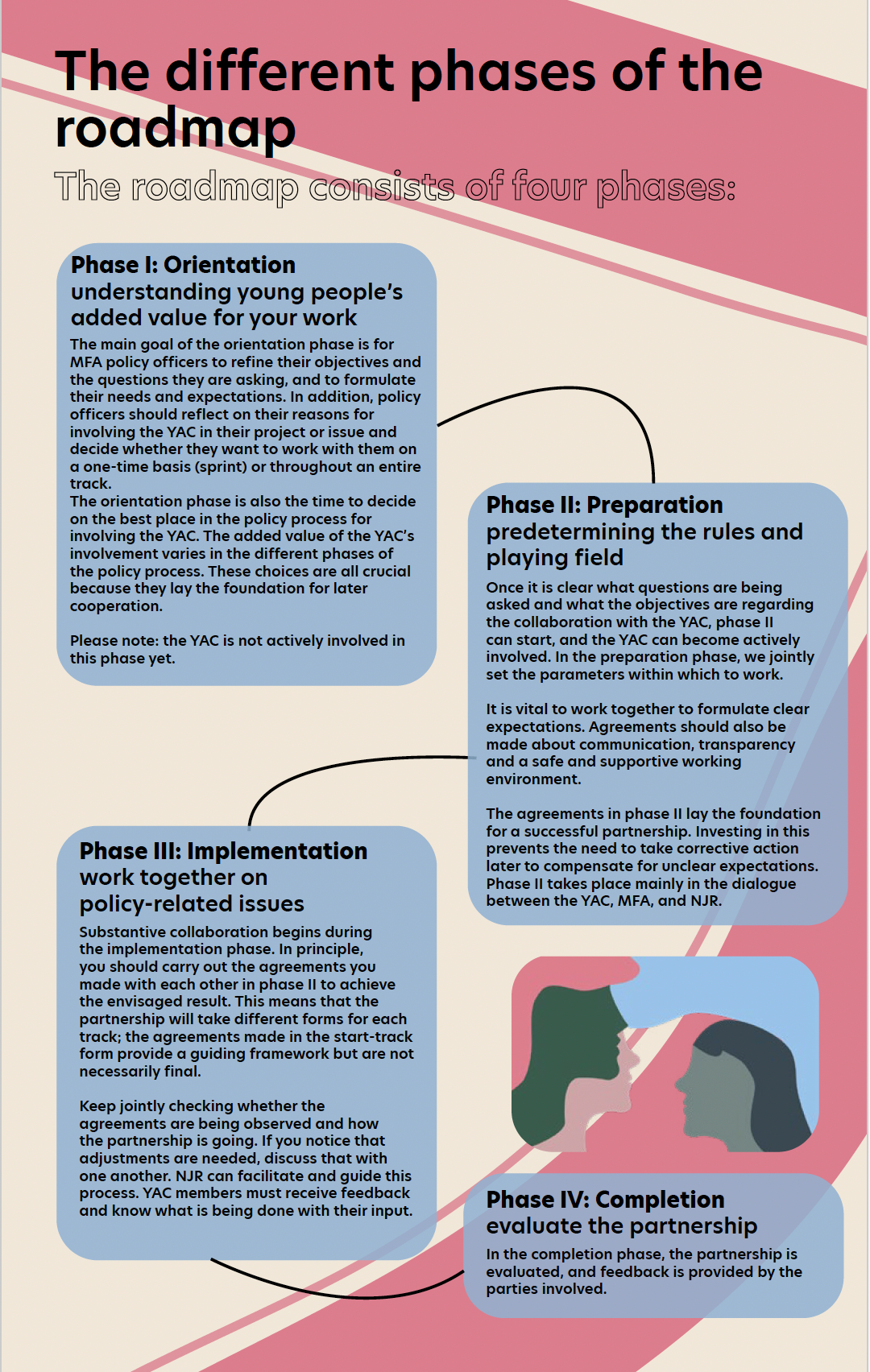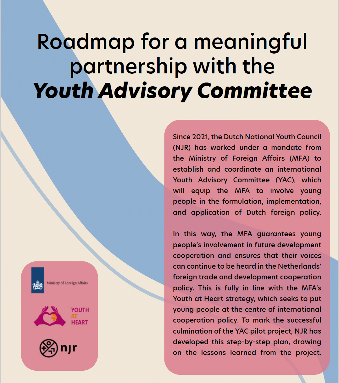 Voor mijn stage bij NJR (Nationale Jeugdraad) was er een opdracht waar ik een 'roadmap' moest maken voor de Jongeren Advies Commissie (Youth Advisory Committee). Omdat het een vrij grote tekst was, wilde de projectleider van YAC de tekst graag wat speelser en overzichtelijker. Ik heb de kleuren van NJR gebruikt om het bijpassend te houden. Ik heb ook wat illustraties toegevoegd die te maken hebben met de YAC.